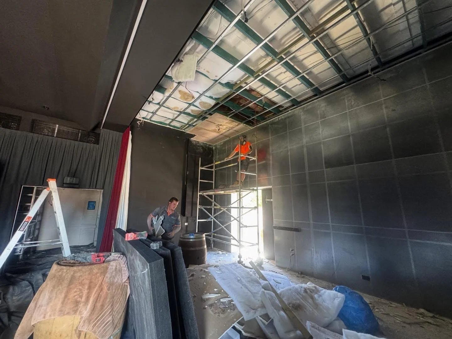 For the first time in twelve months, the sound inside the Tivoli was not silent, but tools, ladders, and builders pulling down the first panels of the damaged ceiling.